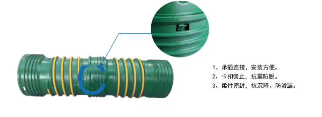 ③ 特别适用于地震多发和不均匀沉降地区的使用,在斜坡、山地、城市坡度大的 排水工程中,既实现了管材连接的方便快捷,又保证了接头的密封效果确保管网安全