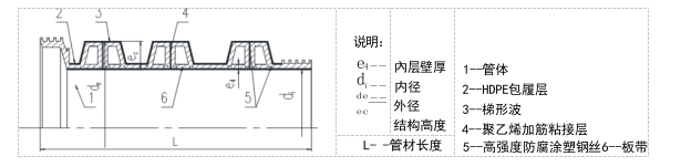 以玄武岩纤维改性高密度聚乙烯BFRPE树脂和高强度碳钢防腐钢丝为主要原材料,通 过挤塑机将原料熔融挤塑成梯形板带,板带底部和波峰加入高强度碳钢防腐钢丝形成三 维网状结构增强筋,经过热态缠绕焊接、覆塑增强,再将管材两端通过高精度注塑机一 次注塑成型承插接头,接头和管材连接处内外表面光滑平整,制成的玄武岩纤维增强聚 乙烯BFRPE加筋高抗管。