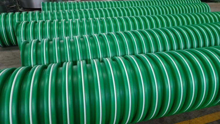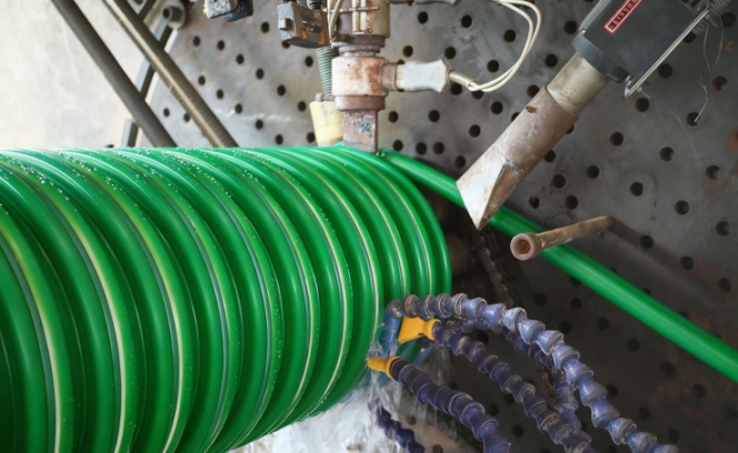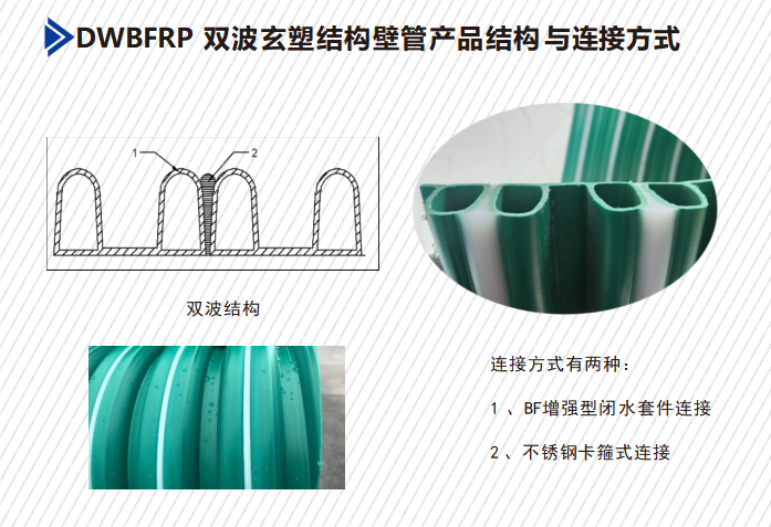 我公司生产的DWB FRP双波玄塑结构壁管采用全新高密度聚 乙烯颗粒热熔双层 共挤技术制板并缠绕成型 ,生产工艺独特;管材内管为双层增强(外绿内白) 板 带 ,光滑平整 ,内壁加入玄武岩纤维,增强管道的耐磨抗腐性以延长管道的使用寿 命;管材外表面所使用的镀铝锌钢带加强肋呈螺旋形 ,波纹状结构 ,以增加管道 的抗外压能力 。产品适用于市政埋地排雨水 、排污水 ,建筑室外排水 ,也适用于 工农业输水 、 引水及泄洪等领域。
